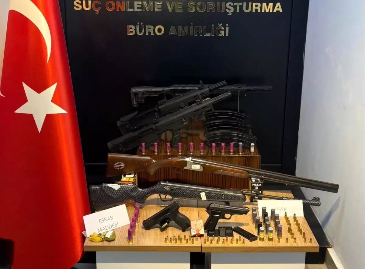 İl Emniyet Müdürlüğü ünitelerinin iştirakiyle gerçekleştirilen operasyonda, yapılan aramalarda 7 adet pompalı tüfek, 2 adet ruhsatsız tabanca, 129 adet kartuş, 100 adet fişek ile 9 gram esrar ele geçirildi.