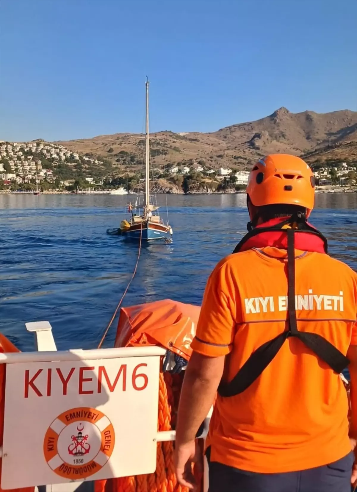KIYEM-6 süratli tahlisiye (can kurtarma) botuna yedeklenen tekne, Bodrum Marina’ya yanaştırıldı.