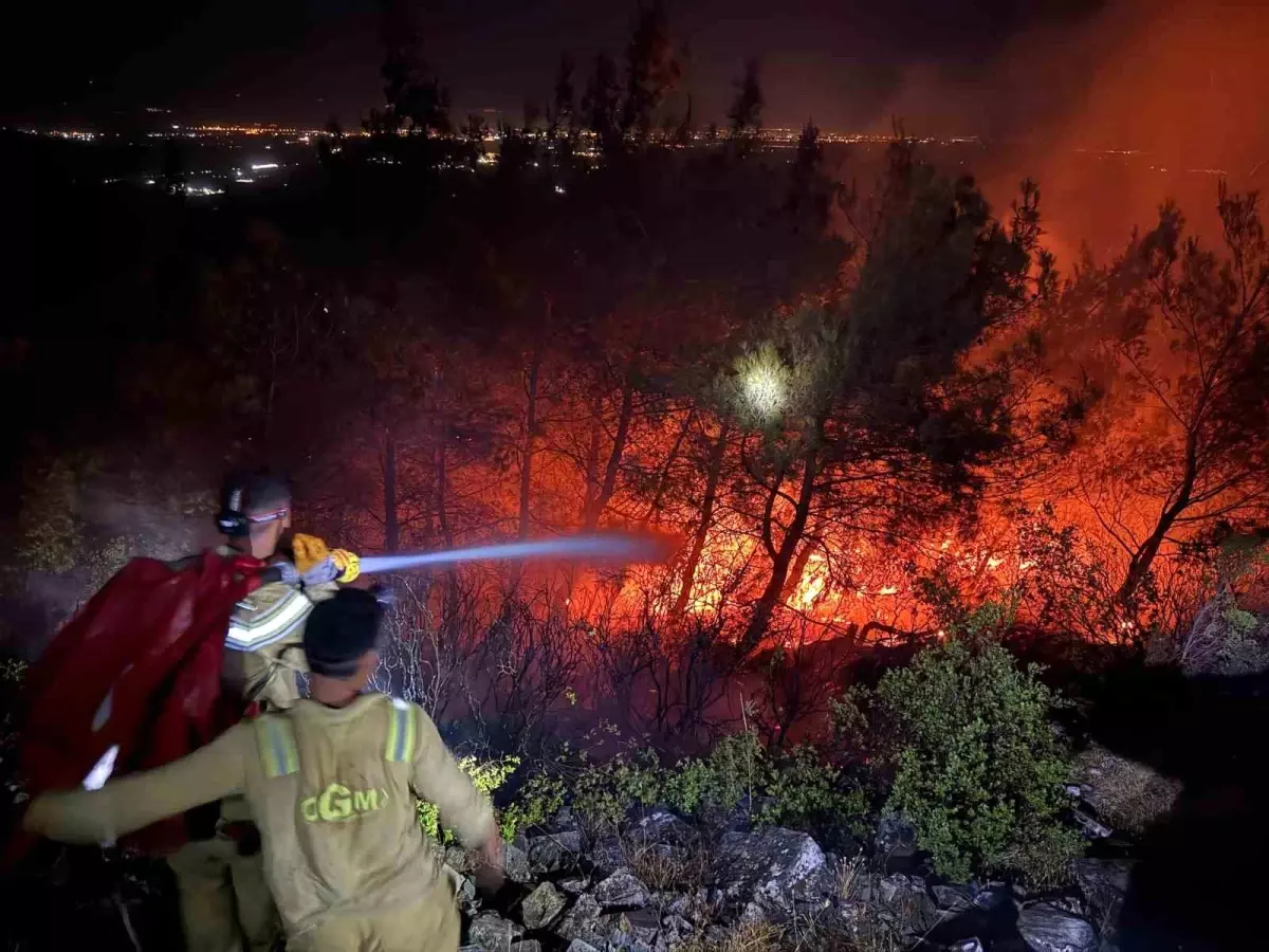 Havanın kararması ile birlikte bölgede alevler geceyi aydınlatırken, grupların yangınla uğraşı sürüyor. – AYDIN